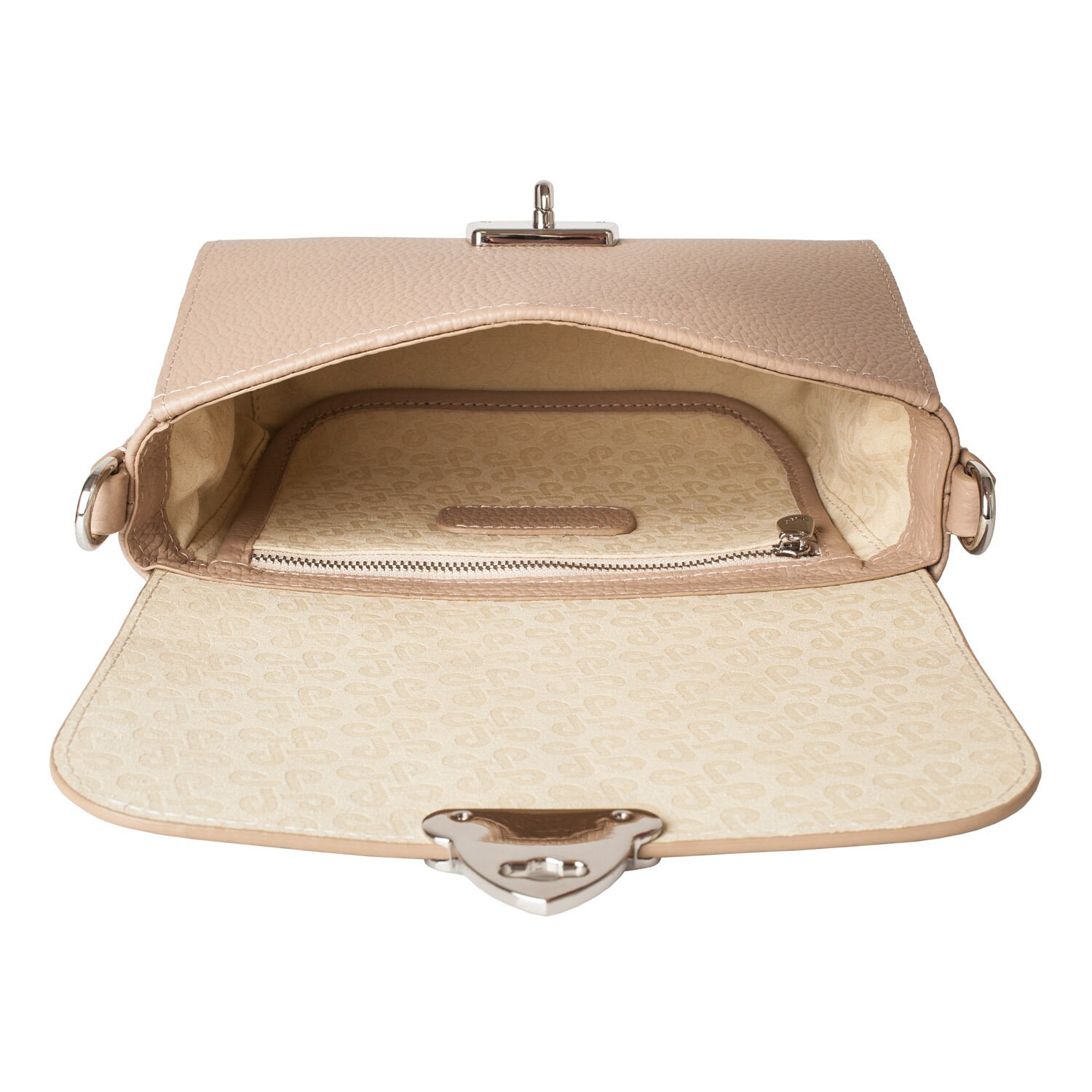 Beige genuine leather woman shoulder bag from Ukrainian designer Katerina Fox. Fashionable and elegant modern bag KF for bright girls and women. This bag is able to attract attention and highlight your exquisite taste. Inside the bag is one large compartment and a convenient zippered pocket for small items, closes the bag on the clasp. The bag is comfortable to wear on the shoulder or across the shoulder.