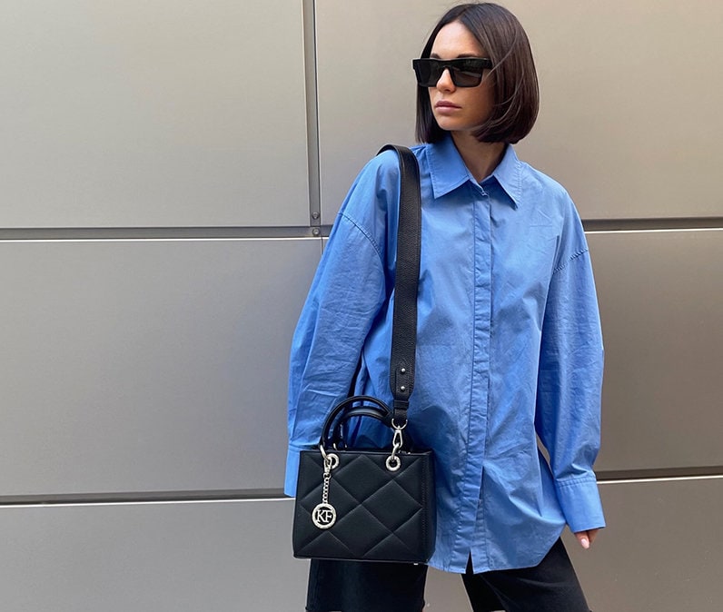 Black genuine leather handbag from ukrainian designer Katerina Fox. This model is designed for women who appreciate the sleek design combined with functionality and comfort. High-quality and reliable hardware ensure long service bags. Inside the bag are three spacious compartments, one with zip, two patch pockets and one zippered pocket closes with a zipper. The bottom of the bag protected by metal feet.